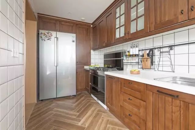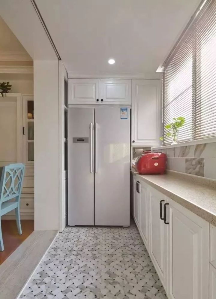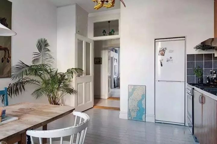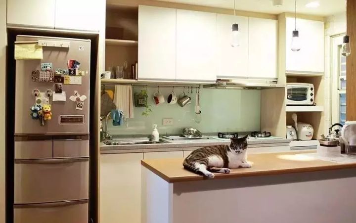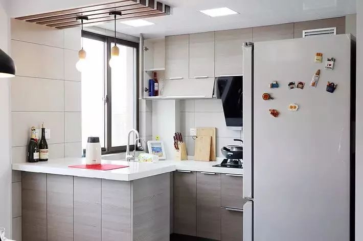 把冰箱“安裝”到櫥柜里面去,這就要求定做櫥柜的時(shí)候,提前為冰箱預(yù)留出尺寸,看到下圖了嗎?冰箱顯得會有點(diǎn)唐突,但好在櫥柜有點(diǎn)連貫性,也可以解決一部分收納問題。如下面幾個(gè)案例: