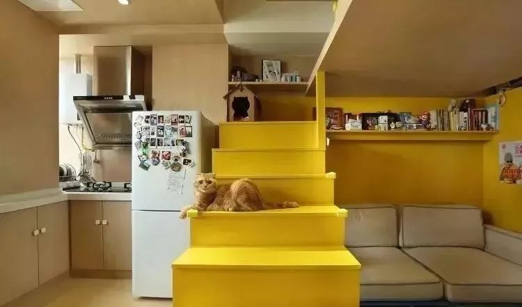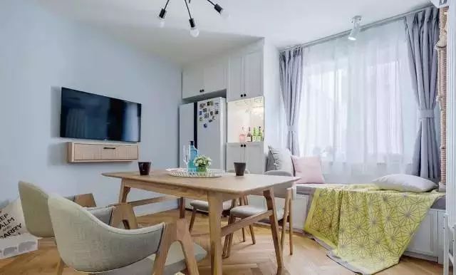 冰箱與柜體合為一體,相當(dāng)節(jié)省空間。靠窗的地方的做了個(gè)榻榻米,等飯之余,靠著讀幾頁書也是挺不錯(cuò)的。